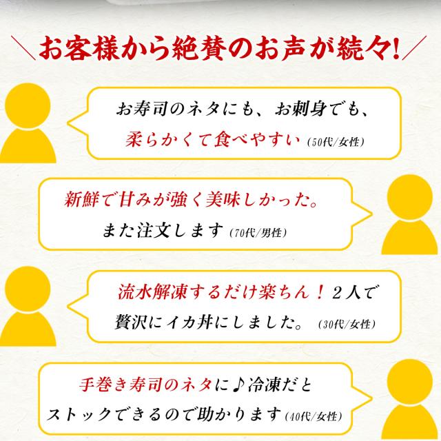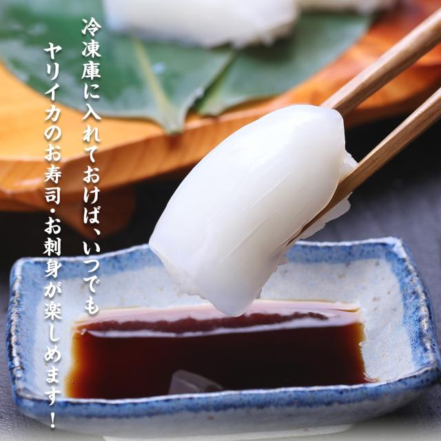 商品のポイント:人気のヤリイカをお寿司のネタ用に食べやすく加工しました!お召し上がりの直前に流水解凍するだけなのでとっても簡単。冷凍庫に入れておけば、いつでもヤリイカのお刺身が楽しめます!お刺身で、お寿司で、海鮮丼で…ヤリイカをぜひお楽しみください♪