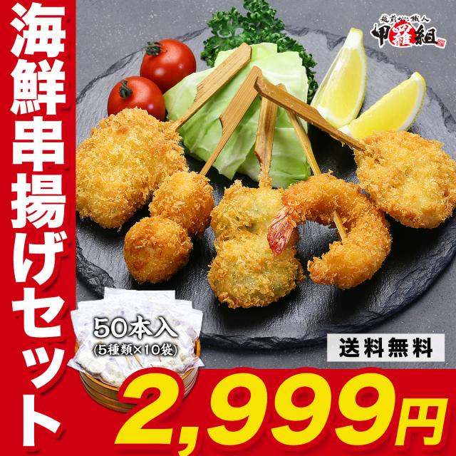 海鮮串揚げ 大ボリューム 50本(5種×10袋) 食べ放題セット (えび/蓮根えび/きす/舌平目おくら巻き/成形いたや貝) エビ 串 パーティー