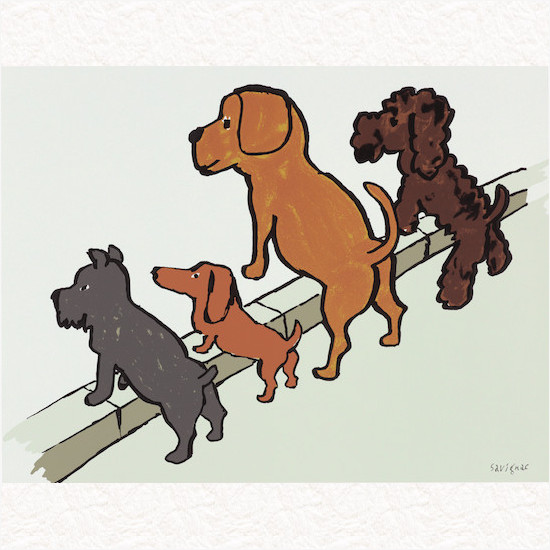 愛犬家の多いパリ市民にマナーを呼びかけるポスターです。犬たち4匹はお行儀良く横一列に並んで見ていますよ。あとは飼い主たちのお行儀の問題。言葉で伝えにくい事柄もサヴィニャックらしいユーモアと視覚的表現で多くの愛犬家達に呼びかけています。こんなに可愛い犬達に見張られては、、、綺麗にするしかないですね。