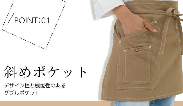 短めのショート丈、使い勝手のよいダブルポケットが特徴的なショートエプロン。