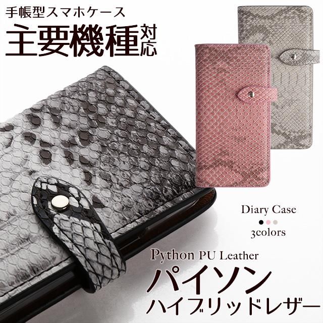 外側カバーには人気のパイソン柄のPUレザー、内側カードポケットにはフルグレインレザーを採用したハイブリッドのベルト付き手帳型ケースです。左利き用(右開き)もご用意しました。