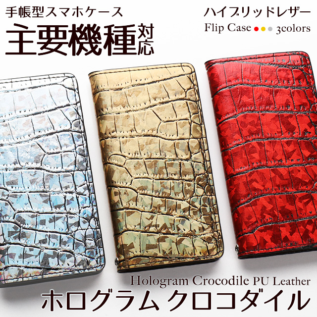 外側カバーには人気のクロコダイル柄にホログラムをプラスしたPUレザー、内側カードポケットにはフルグレインレザーを採用したハイブリッドの手帳型ケースです。左利き用(右開き)もご用意しました。