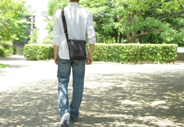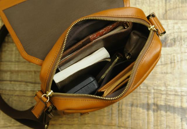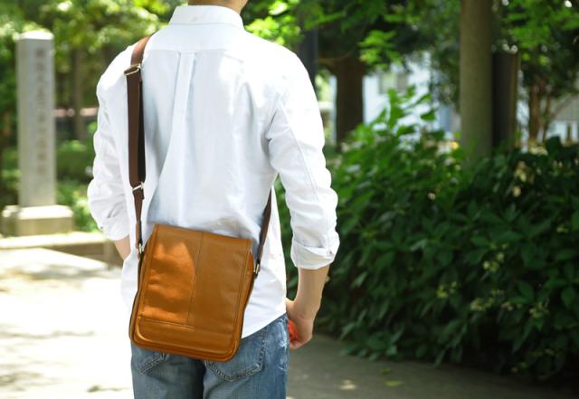「豊岡鞄」認定製品。牛革を使用したボックス型ショルダーバッグ。