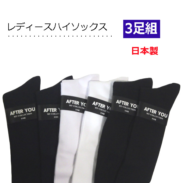 ハイソックス レディース【3足組】無地 36cm丈 リブ 平無地 日本製