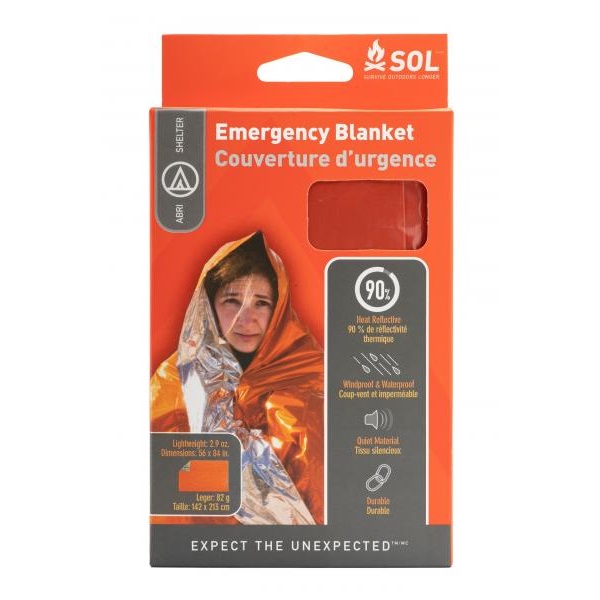 | 1人で使うサイズの非常用ブランケット。 体熱の90%を反射させて体温を維持する特殊な素材「ヒートシート」を採用しています。 使うときは簡単に広げられ、音も静かです。また引き裂き強度が強く、すぐに破けるということもありません。 外側のオレンジ色は要救助者を見つけやすいよう、目立つ色になっています。 アウトドアにお出かけの時だけでなく、ご家庭や職場にもご用意いただくと安心です。 ●サイズ/142×213cm ●重量/82g 【ヒートシート】 ヒートシートはアメリカのA.F.M(Advanced Flexible Material 社)が開発したポリエチレンの生地に特殊技術で純度99.999%の高純度なアルミを蒸着加工したシートです。 A.F.M 社はアメリカ宇宙財団のメンバーとしてNASA の開発した技術の民間利用を促進しており、宇宙財団から反射断熱材技術のカテゴリーにおいて独占件を認められています。 ヒートシートを使用した製品はスペーステクノロジーをフィードバックした製品として宇宙財団の認証マークの使用が許可され信頼の証となっています。 アドベンチャーメディカルキット社ではA.F.M 社の技術力にの高さに着目しヒートシートを使用したブランケットをはじめとしたサバイバルグッズ専門のS.O.Lブランドを新たに展開しアメリカ、カナダをはじめ多くの国々で好評を得ています。 S.O.L のヒートシートを使用した製品は類似の一般的にエマージェンシーシートと呼ばれている ポリエステルを生地に使用した他社製品と比べ多くの面で優れています。 ●体が放射する熱の90%を保持 ●素材がポリエチレンのため非常にしなやかで繰り返しの使用が可能 ●ガサガサ感が無く簡単に折りたたむことが可能 ●人体に有害な成分を含まず安心して使用することが出来る ●キズが付いた場合もポリエステル生地のブランケットのように裂けてしまうことが無く補修可能 ●ポリエステル生地の他社製品に比べ30 〜 50%薄いにも関わらず強度は他社製品を上まわる |