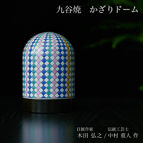 九谷焼の伝統工芸士 中村重人さんの絵付けと、日展作家の木田弘之さんによる造形の最高技術が生み出した至極の逸品。土台には木目が美しい高価な欅を山中漆器の黒漆で仕上げており、複数の伝統技術を駆使した格調高い飾り置物です。コードのない電池式で、どこでも「灯り」を楽しめます。「かざりドーム」は、考えられた飾りやすい形状が特徴で、オフィスや自宅など、お好きな場所で作家品を楽しみ、存在感のある空間づくりを演出できます。