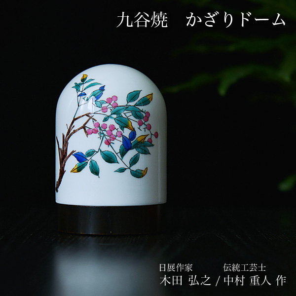 九谷焼の伝統工芸士 中村重人さんの絵付けと、日展作家の木田弘之さんによる造形の最高技術が生み出した至極の逸品。土台には木目が美しい高価な欅を山中漆器の黒漆で仕上げており、複数の伝統技術を駆使した格調高い飾り置物です。コードのない電池式で、どこでも「灯り」を楽しめます。「かざりドーム」は、考えられた飾りやすい形状が特徴で、オフィスや自宅など、お好きな場所で作家品を楽しみ、存在感のある空間づくりを演出できます。