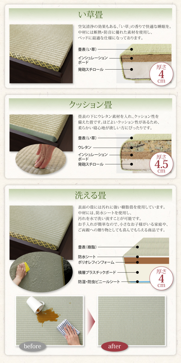 い草畳:洗える畳:樹脂畳+(ポリプロピレン)ポリオレフィンフォーム