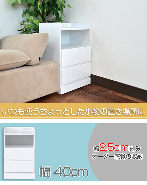 ![]() ![]() お部屋のちょっとしたすき間に置けるサイドチェスト お部屋のちょっとしたすき間に置けるサイドチェストです。いつも使う携帯やテレビのリモコンなど、ちょっとした小物を置く場所に困ったことはありませんか? 限られたスペースや諦めていたすき間をフル活用して、欲しいものにすぐに手が届く快適な空間に・・・ ![]() すき間にぴったりのサイズを選べる 幅20cm〜40cmを2.5cm刻みにした豊富なサイズなのであらゆるすき間にぴったりと置くことができ、わずかなスペースを有効活用できます。 ![]() 便利な2個口コンセント付き ベットサイドやソファサイドなどで使うときに役立つ2個口コンセント付きです。携帯電話の充電や読書時の照明などの電源に使えて便利です。 ![]() ![]()