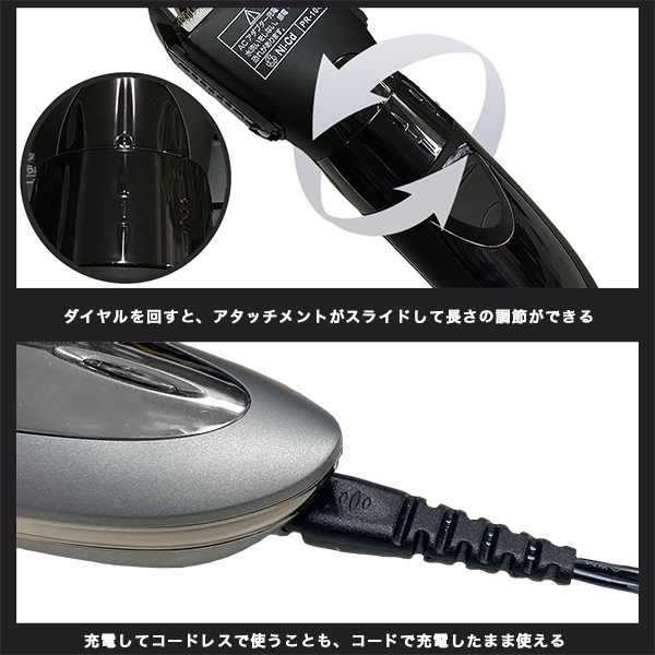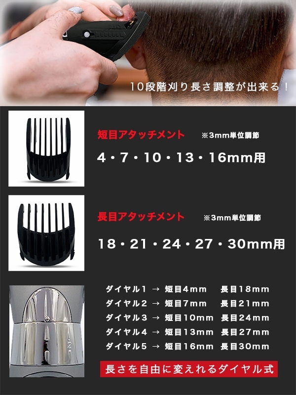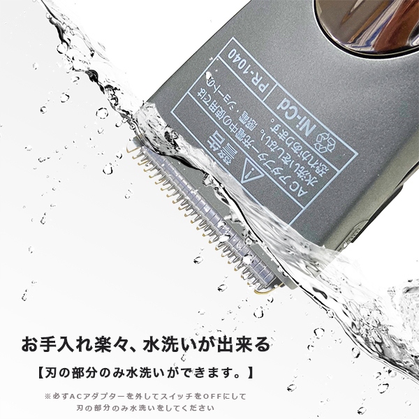 付属品:ACアダプター・、清掃ブラシ、クシ、2アタッチメント(刈高調整機能4mm〜30mm、10段階)