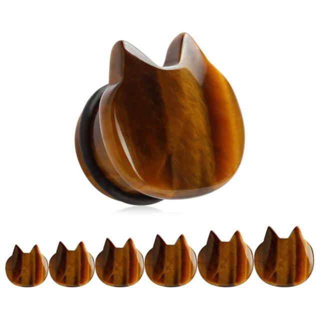 [2G 0G 00G 12mm 天然石 ボディピアス] タイガーアイ風 ネコ型ストーン ストーンプラグ ボディーピアス おもしろ 面白い ネコ 猫 キャット アニマル 動物 メンズ レディース 2ゲージ 0ゲージ 00ゲージ 12.0mm 12ミリ 金属アレルギー対応 パワーストーン 天然石風 プレゼント