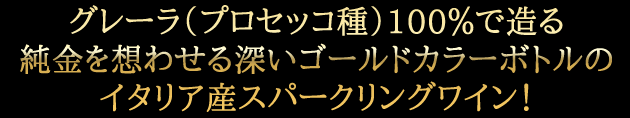 こだわりイタリア産スパークリングワインファン大注目!グレーラ(プロセッコ種)100%!ボッテガ社はヴェネツィアから北に約45キロ、イタリアを代表する食後酒グラッパと近年世界からも熱い注目を集めているスプマンテ、プロセッコの名産地であるコネリアーノ郊外に位置。純金を想わせる深いゴールドカラーボトルは特別なプロセスで三度に渡るコーティングを施し、直射日光や温度変化からワインを守り、フレッシュな味わいをキープ!ゴールデン種のリンゴ、パッションフルーツ、バナナ、パイナップル、藤、アカシアの花の豊かな芳香。焼き立てのパンの皮を想わせる香ばしい酵母の香り。非常にフルーティーでまろやかな酸味と豊かなミネラル感の調和のとれた味わい。爽やかな喉ごしと鼻腔をみたす新鮮な果実と白い花のアフターテイストが心地よい味わいの辛口スプマンテ!ボッテガ社最高峰!豪華なゴールドボトルはプレゼントやパーティ、お祝いの席にも最適です!