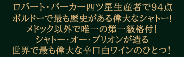 超入手困難!ボルドー最高峰のひとつ、グラーヴ最高級格付辛口白ワイン!ボルドーで最も歴史のある偉大なシャトー!メドックの格付時、例外として1つだけ組み入れられた偉大なグラーヴ格付第一級!年産500ケースあまりしか造られない非常に希少価値のある辛口白ワインとして有名!パーカー氏は「オー・ブリオンで造られた辛口白ワインは、グラーヴ地方で最上のワインであると評価されている驚異的なモンラッシェのようにふくよかな舌触りのある白のグラーヴづくりを追求するジャン・テルマの指導のもと、この白ワインはまったく力強いものとなっている。最良のヴィンテージなどは、荘厳な豊かさと複雑さを備えた驚くべき出来を示している。」と絶賛し94点!ワインスペクテイター、ワインエンスージアスト、ゴーミヨ、レヴュー・デュ・ヴァン・ド・フランス大注目!世界で最も偉大な辛口白ワインのひとつ!愛好家垂涎!究極のペサック・レオニャン最高級辛口白ワインが限定で極少量入荷!◆Chateau Haut Brion Blanc 2008 AOC Pessac Leognan◆種類:白ワイン/辛口◆生産地:フランス/グラーヴ/AOCぺサック・レオニャン◆ヴィンテージ:[2008]年 ◆内容量:750ml