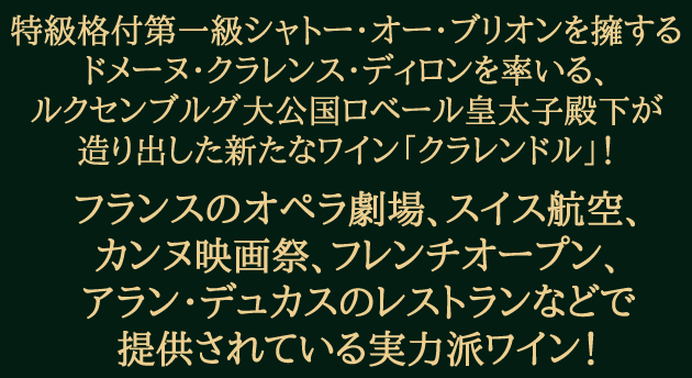 ![]() 特級格付第一級=シャトー・オー・ブリオン、同じくシャトー・ラ・ミッション・オー・ブリオンを擁するドメーヌ・クラレンス・ディロン。このグループを率いるルクセンブルグ大公国ロベール皇太子殿下が造り出した新たなワインが「クラレンドル」です。「クラレンドル」のアイディアソースは意外なことにシャンパーニュにあります。グラン・メゾンのノン・ヴィンテージ・シャンパーニュは、様々なエリアから上質な葡萄を選び、それらをアッサンブラージュすることで独自の味わいと安定したスタイルを造り出す。ロベール殿下はボルドーでも同じことが可能だと考えました。 ![]() そしてオー・ブリオンの葡萄を含む、ボルドー全域からクオリティの高い葡萄を選抜し、“クラレンドル・スタイル”を造りあげました。クラレンドルのスタイルは上品でクラシック。ボルドーらしい骨格と複雑さを併せ持ち、料理を引き立たせるバランスの良さが魅力です。 ![]() ロベール皇太子殿下のこだわりは、そのボトルデザインも表現されています。肌ざわりの良い上質なラベルが貼られ、ボトルの注ぎ口には「CLARENDELLE」の刻印が刻まれており、通常のものよりやや背が高い高級感溢れるボトルは、贈り物にも最適。カンヌ映画祭、テニスのフレンチオープンの他、フランスのオペラ劇場、アラン・デュカスのレストラン、スイス航空でも提供されている実力派の“クラレンドル”をどうぞご堪能ください。 |