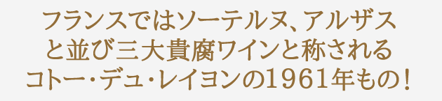 ロワール高級甘口白ワイン愛好家大注目!至高の古酒コレクション!飲み頃60年熟成!しかも希少な二ツ星ヴィンテージの1961年もの!ヒュー・ジョンソン氏は「見事な酸味を持った甘口白ワインは永遠に熟成を続ける」と四ツ星!フランスでは三大貴腐ワインと称されるコトーデュレイヨンの1961年もの!造り手はこの地を代表するシャトーのひとつで、ベタンヌ&ドゥソーヴ2014年版でレイヨンの6人のひとりとして掲載!ほぼ毎年のように登場し、不動のプレステージであり続けています。ボーリュー・シュル・レイヨン村のシスト土壌自社畑からシュナン・ブラン100%を収量25〜30hlの低収量。長期熟成を目指すためステンレスタンクで醸造&7ヶ月熟成!残糖は50〜60g/L!53年近くをカーヴで大切に熟成し、素晴しいものだけをリリース!現地セラー数ヶ月前の蔵出しで限定入荷!1961年(昭和36年)生まれの方へのプレゼントや60周年のお祝いに最適!◆Coteaux du Layon Beaulieu Vieille Vigne 1961 Chateau du Breuil◆種類:白ワイン/甘口◆生産地:フランス/ロワール/AOCコトー・デュ・レイヨン ボーリュー◆ヴィンテージ:[1961]年 ◆内容量:750ml
