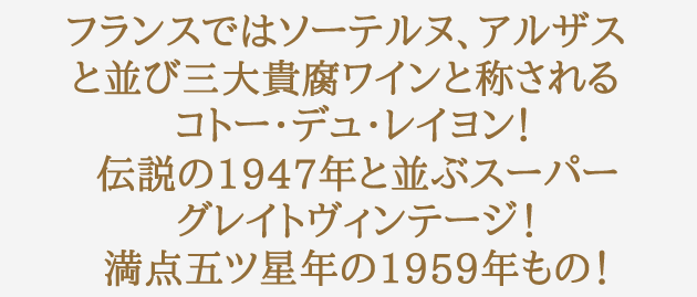 ボーリュー・シュル・レイヨン村にて1822年より続くこの地を代表するシャトーのひとつで、ベタンヌ&ドゥソーヴ2014年版にもレイヨンの6人のひとりとして掲載のシャトー・デュ・ブルイユの造り手による、64年カーヴで大切に熟成し、素晴しいものだけをリリース!しかも世紀のヴィンテージで伝説の1947年に並ぶスーパーグレイトヴィンテージ!満点★★★★★5つ星の[1959]年もの!■さまざまなギフトアイテムをご用意しております。お中元 ギフト 御中元 お盆 お礼 敬老の日 クリスマス 冬ギフト お歳暮 御歳暮 お年賀 御年賀 お正月 年末年始 ご挨拶 バレンタイン ホワイトデー お返し 父の日 母の日 ギフト 贈答品 お土産 手土産 御祝 御礼 内祝い 引き出物 お祝い 結婚祝い 結婚内祝い 出産祝い 出産内祝い 引き菓子 快気祝い 快気内祝い 進学祝い 誕生日祝い バースデーケーキ プレゼント Wedding ウェディング ホームパーティ お花見 パーティ 退職ギフト 退職 就任祝い