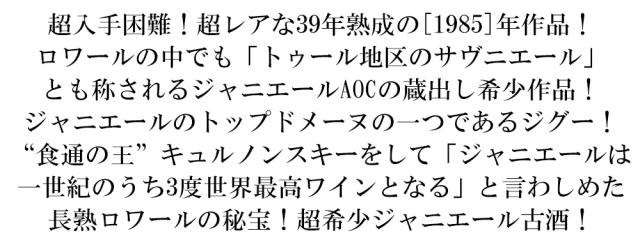 超入手困難!超レアな39年熟成の[1985]年作品! ロワールの中でも「トゥール地区のサヴニエール」 とも称されるジャニエールAOCの蔵出し希少作品! ジャニエールのトップドメーヌの一つであるジグー! “食通の王”キュルノンスキーをして「ジャニエールは 一世紀のうち3度世界最高ワインとなる」と言わしめた 長熟ロワールの秘宝!超希少ジャニエール古酒!