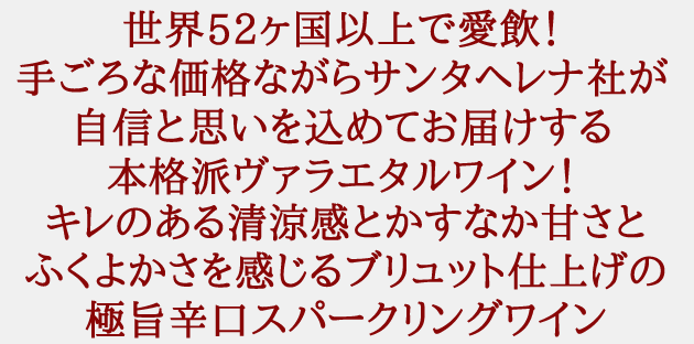 チリ辛口スパークリングファン大注目!旨安ワイン愛好家に朗報!超お買い得なハイコスパ辛口スパークリングワイン!1942年創業のサンタ・ヘレナ社はいちはやく海外進出を果たしたチリワイン界における輸出ブランドのパイオニア!今では世界52ヶ国以上で愛飲されており、長年培ったワイン造りのノウハウをいかしつつ、より高い品質を目指して活動を開始。サンタヘレナ社のワインは今後ますます世界のワイン愛好家の注目を集めていくこと間違い無し!チリをはじめ南アフリカを代表する動物であるアルパカ!手ごろな価格ながらサンタヘレナ社が自信と思いを込めてお届けする本格派ヴァラエタルワイン!シャルドネとセミヨンを使用。爽やかでキレのある清涼感とかすなか甘さとふくよかさを感じるブリュット仕上げの極旨辛口スパークリングワインが登場!