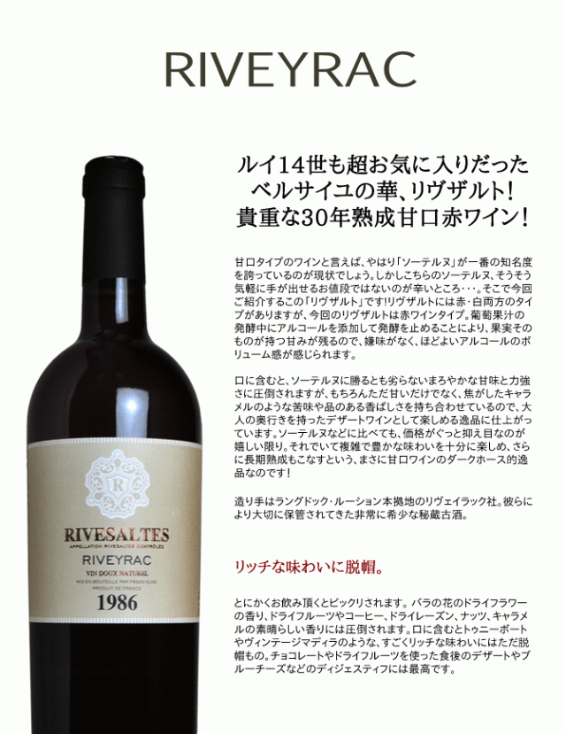 超希少!入手困難!フランス甘口赤ワイン愛好家大注目!オールドヴィンテージファン、デザートワインファン、ヴァン・ド・ナチュールファン大注目!飲み頃30年熟成バックヴィンテージの超希少限定古酒!造り手はラングドック・ルーション本拠地のリヴェイラック社!彼らにより大切に保管されてきた非常に希少な秘蔵古酒!今人気爆発のラングドック・ルーションの甘口の雄!年々プレゼント用と同じくらい需要が高まっている「自分用」「バースデーヴィンテージ」のプレミアム・スイーツワイン!ルイ14世も超お気に入りだったと言うベルサイユの華!リヴザルトAOCの希少限定古酒!30年熟成の記念ボトル!30周年記念のお祝いに!昭和61年生まれの方へのバースデープレゼントに最適です!! ◆Rivesaltes 1986 RIVEYRAC◆赤ワイン/フルボディ/甘口◆フランス/ラングドック・ルーション/AOCリヴザルト◆ヴィンテージ:[1986]年 ◆内容量:750ml