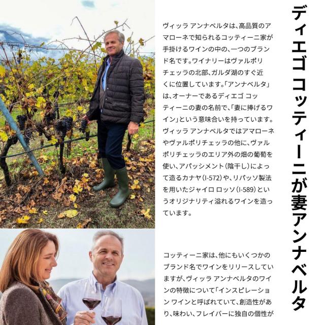 ヴィッラ アンナベルタは、240haの契約畑を直接管理。夫人アンナベルタに因んだ名前です。コメ、ジャイロ、カナヤなど、多くのオリジナルワインを生み出しています。広く輸出しており、国際市場で愛好家、美食家に好まれることも考慮しています。モンテ ゾーヴォは、自家畑100%。ヴェローナ地域において、標高800mの高地で最初に葡萄栽培を始めたパイオニアで、CO2の排出量の削減やSO2フリーへの挑戦などを行っています。