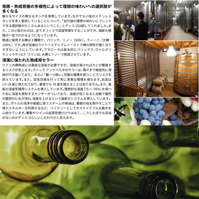 ヴィッラ アンナベルタは、ハイレベルなアマローネなどを造る家族経営の生産者です。10haから始めたワイン作りは、現在レンタルを含め380haでワイン造りをするまでになりました。アンナベルタは夫人の名前で、「アンナベルタの家」という意味です。セラーの設計は全て夫人の手によるものです。美しく素晴らしいワイナリーです。アマローネやカナヤにする葡萄は区画で決めています。ヴァルポリチェッラ用の品種は、斜面の畑でのみ栽培しています。平地は、白品種に向いています。畑仕事は、「仕事でなく楽しみ。良いワインが出来ることに喜びを感じる」と語ります。