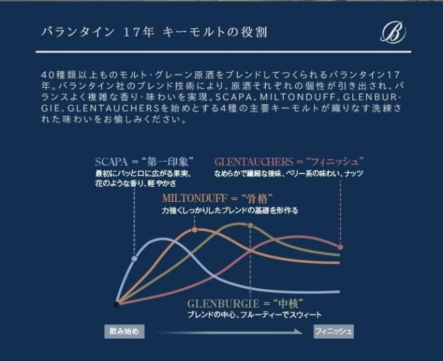 超人気ブレンデッドウィスキー!バランタイン17年もの!奥行きの深い調和を求めると、異なるシングルモルトが40種ほど必要でした。充分なまろやかさ、豊かさにしてなお力強く、瑞々しさを失わない原酒となると酒齢17年がベストでした。こうしてバランタイン社の名ブレンダーの手で究極のスコッチが誕生したのは1937年のこと。以来その処方は変わらず、この一瓶は“ザ・スコッチ”として讃えられ、スコッチを知る人には垂涎の逸品とされ大人気ブレンデッドモルト。明るい琥珀カラー。甘いバニラ、オークといったアロマに花のようなさわやかなアロマ。クリーミーなバニラのような甘い味わいに軽いスモーキー香、潮のような余韻が長く続くバランタイン17年をぜひ一度ご賞味下さい。