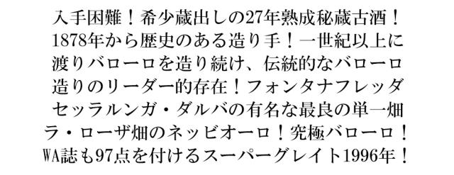 入手困難!希少蔵出しの27年熟成秘蔵古酒!1878年から歴史のある造り手!一世紀以上に渡りバローロを造り続け、伝統的なバローロ造りのリーダー的存在!フォンタナフレッダセッラルンガ・ダルバの有名な最良の単一畑ラ・ローザ畑のネッビオーロ!究極バローロ!WA誌も97点を付けるスーパーグレイト1996年!■さまざまなギフトアイテムをご用意しております。お中元 ギフト 御中元 お盆 お礼 敬老の日 クリスマス 冬ギフト お歳暮 御歳暮 お年賀 御年賀 お正月 年末年始 ご挨拶 バレンタイン ホワイトデー お返し 父の日 母の日 ギフト 贈答品 お土産 手土産 御祝 御礼 内祝い 引き出物 お祝い 結婚祝い 結婚内祝い 出産祝い 出産内祝い 引き菓子 快気祝い 快気内祝い 進学祝い 誕生日祝い バースデーケーキ プレゼント Wedding ウェディング ホームパーティ お花見 パーティ 退職ギフト 退職 就任祝い
