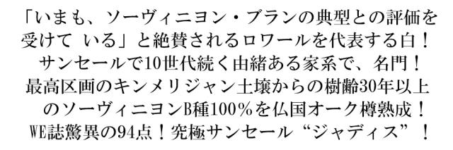 「いまも、ソーヴィニヨン・ブランの典型との評価を 受けて いる」と絶賛されるロワールを代表する白! サンセールで10世代続く由緒ある家系で、名門! 最高区画のキンメリジャン土壌からの樹齢30年以上 のソーヴィニヨンB種100%を仏国オーク樽熟成! WE誌驚異の94点!究極サンセール“ジャディス”!