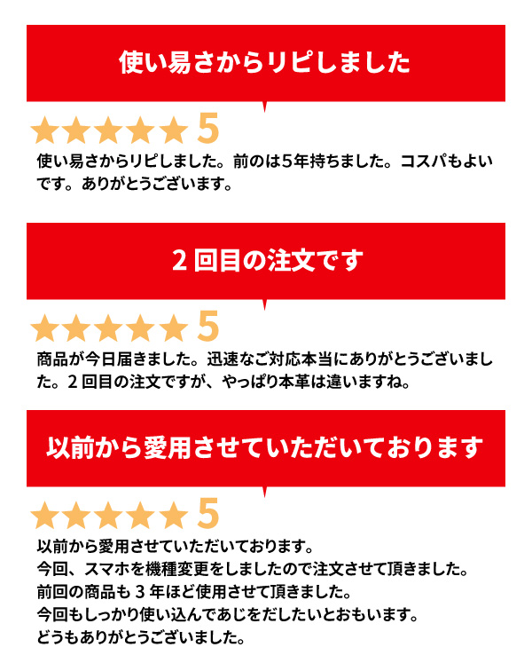 - 合皮の携帯ケースを使っていたが、一年もしないうちに縁が劣化してきたので、こちらを購入。 色合い、手触りもよく、気に入ってます。