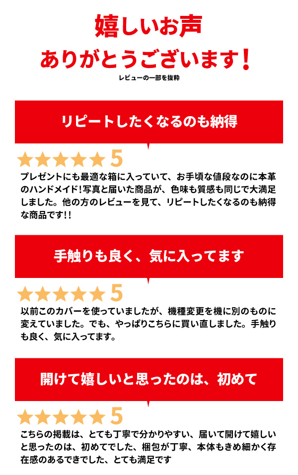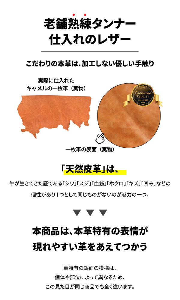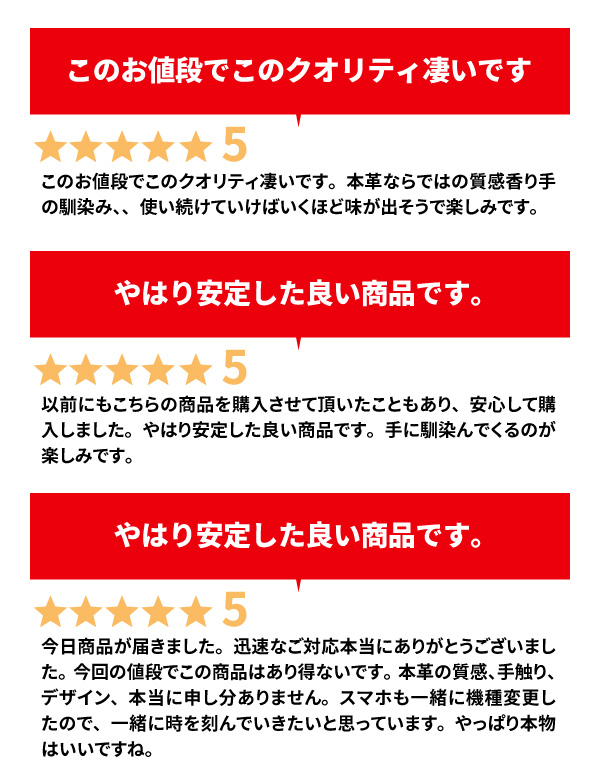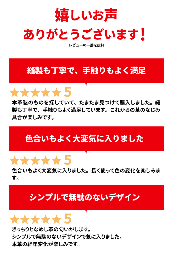 - たいへん良い商品でリピート購入しています。 1度目はブルー、2度目はレッド、今回はキャメルを購入しました。質感も良く、使い込むうちに色合いも良くなり、気に入っています。今後も使い続けます。