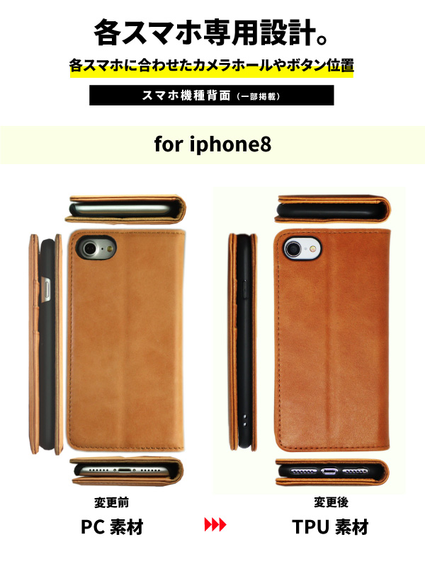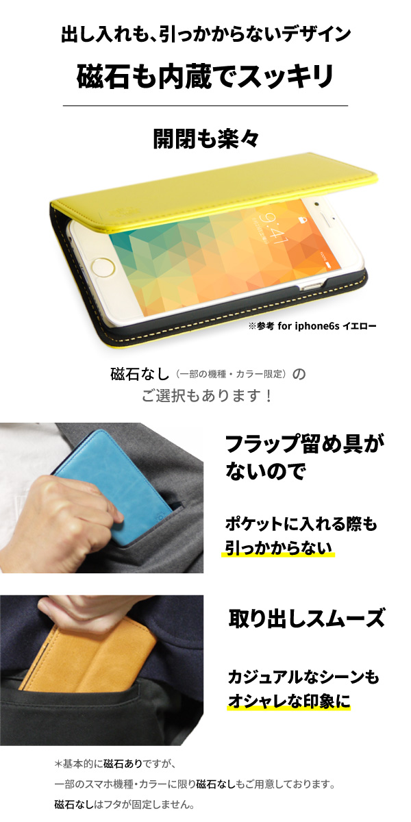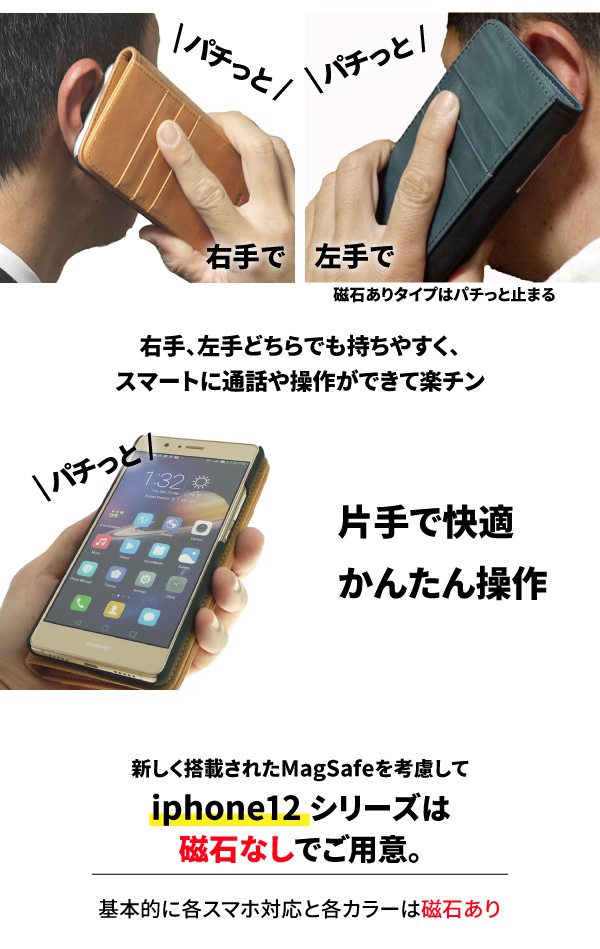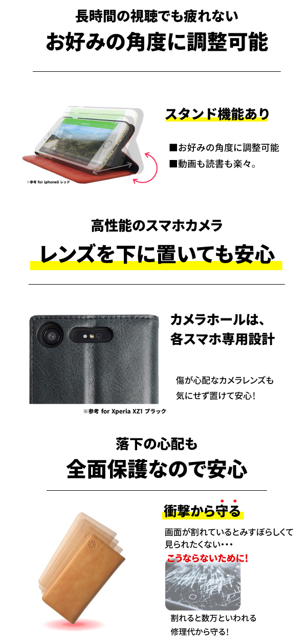 スタンド機能・カードポケット・マグネット内蔵・カメラホールあり・各スマートフォン専用設計