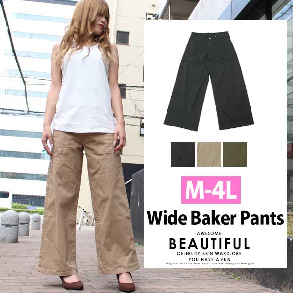 秋新作 大きいサイズ レディース ツイルワイドベイカーパンツ ゆったり リラックス 美脚 チノパン 大きいサイズ ビッグシルエット カーキ ベージュ 黒 M L LL 3L 4L レディース