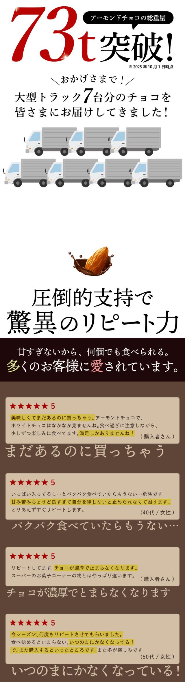 ひと口かじれば、濃厚でなめらかなチョコと香ばしいアーモンドのハーモニーが口いっぱいに広がります。 さらに新しく「ミルクアーモンドチョコ」「ダークアーモンドチョコ」が仲間入り。 定番の「ホワイトアーモンドチョコ」と合わせて、気分や好みに合わせて選べる3種類をご用意しました。 |
