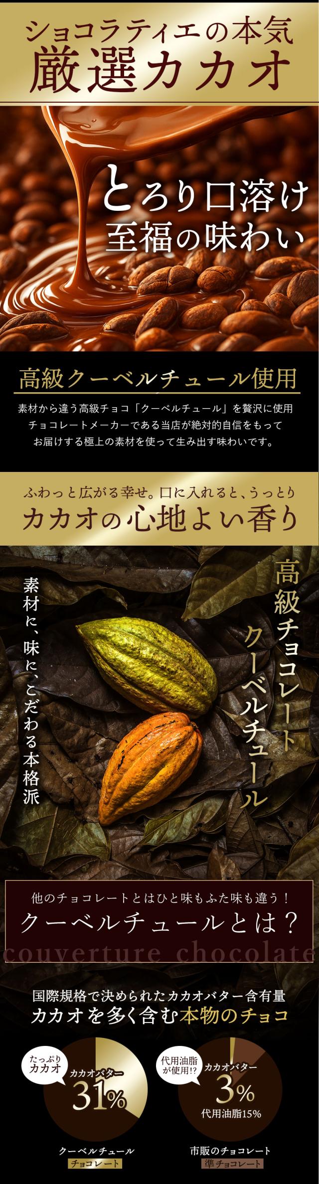 ご注意:※高温で溶けたチョコレートは冷えると白く固まることがあります。これはチョコレート中の油脂分で、風味は劣りますが食べても問題ありません。