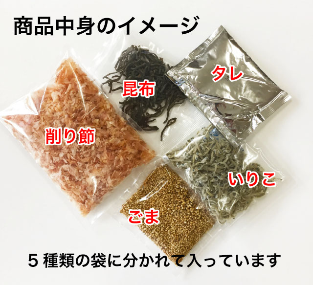 ボールなどの容器に「いりこ」「ごま」「昆布」「削り節」「たれ」を入れて混ぜるだけです。