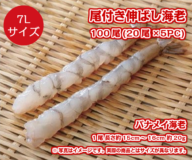 業務用 冷凍 尾付き伸ばし海老 バナメイ海老 7Lサイズ 100尾 20尾×5PC入り 約15cm〜16cm 約20g 【エビ】