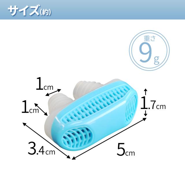 | イビキ対策 無呼吸改善 鼻呼吸装置 快適で良質な睡眠を。 ケース付で軽く、コンパクトなので、 旅行先にも持っていくことができます。 ご自身のいびき、ご家族、パートナーのいびきや 睡眠の質にお悩みの方にオススメのアイテムです。 電源や配線もなく、維持費や電気代はかかりません。 リーズナブルなのに、効果的! 抜群のコストパフォーマンスです。 装着方法は、鼻に差し込むだけの簡単装着です。 【商品詳細】 サイズ:フリーサイズ(約)幅:5×奥行:3.4cm 鼻腔部分直径:(約)0.6cm 鼻腔部分長:(約)1.5cm 重さ(約):9g 収納ケースサイズ:(約)直径5.4cm×幅6cm厚み2.8cm 重さ:(約)18g 箱サイズ:(約)横6.9×縦5.7×奥行3cm 重さ:(約)26g |