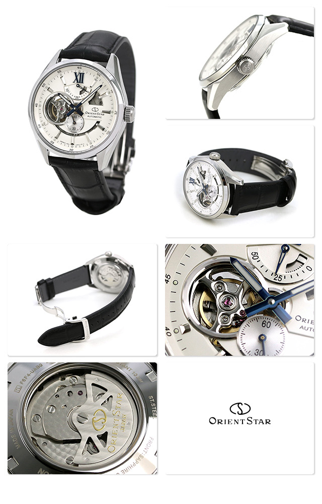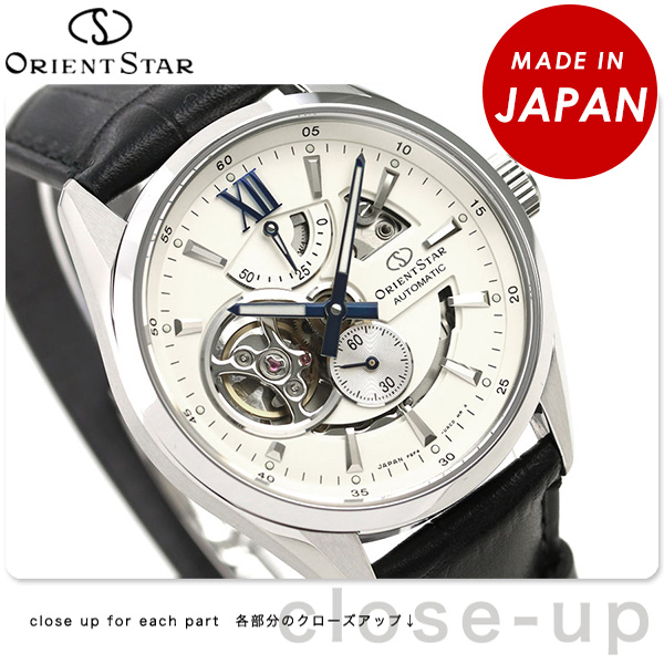 入荷時期未定予約受付中 正規品 7年保証キャンペーン 送料無料 オリエントスター コンテンポラリー モダンスケルトン 41mm オープンハート スモールセコンド 日本製 自動巻き メカニカル メンズ 腕時計 RK-AV0007S ORIENT STAR CONTEMPORARY MODERN SKELETON アナログ ホワイト×ブラック 革ベルト ◆オリエントスターは、1950年のオリエント創業と同時に輝ける星として生まれた代表的なブランドにふさわしく、歴史に裏付けされた技術と、ディテールにまで配慮した粋なデザインの機械式時計を展開。ベーシックモデルからハイスペックモデルまで多彩なラインナップが魅力です。 モダンスケルトンからパワーリザーブが約50時間以上になったモデルが登場。9時位置にあるテンプ部分は、よりはっきり見えるセミスケルトンに変更。高級感あふれるデザインとスケルトンから覗くムーブメントがワンランク上の腕元を演出。スーツスタイルから、休日の大人カジュアルまで幅広く合わせることができるウォッチです。 発売日:18年10月発売 機械式腕時計 Made in Japan