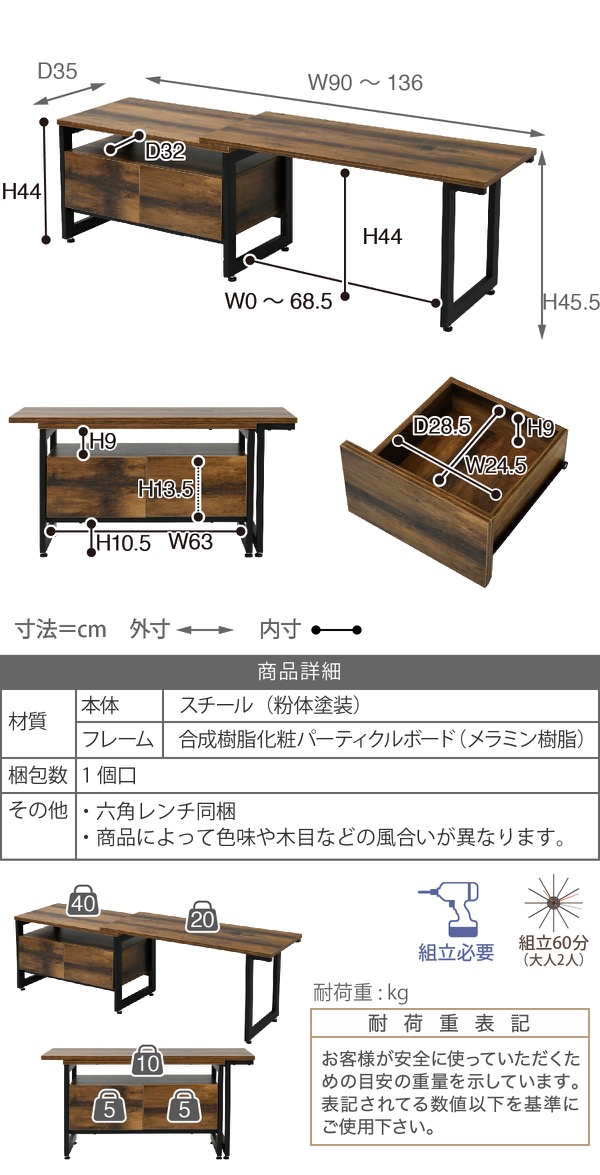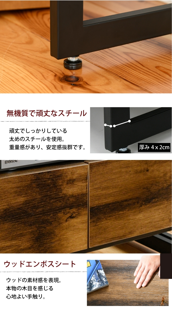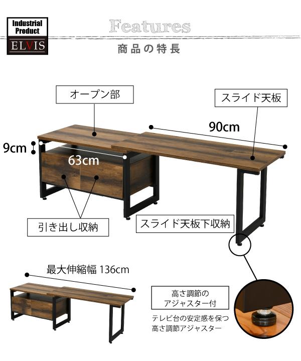 美しさと機能性を兼ね備えた、シンプルながらも深みのあるデザインのテレビ台。伸縮式なのでお部屋のレイアウトに合わせて調整できます。引き出しにはDVD、ブルーレイ等が収納可能。雰囲気のあるインダストリアルスタイルを気軽にお楽しみいただけます。