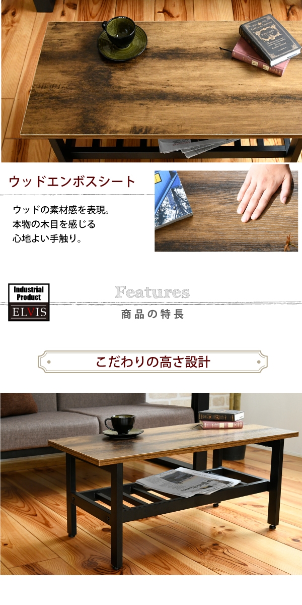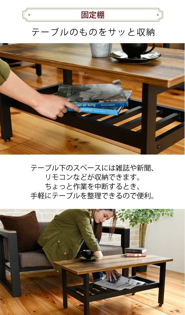 美しさと機能性を兼ね備えた、シンプルながらも深みを感じさせるデザインのリビングテーブル。抜け感のあるデザインが特徴的な収納部には、雑誌やリモコン等を収納可能。雰囲気のあるインダストリアルスタイルを気軽にお楽しみいただけます。