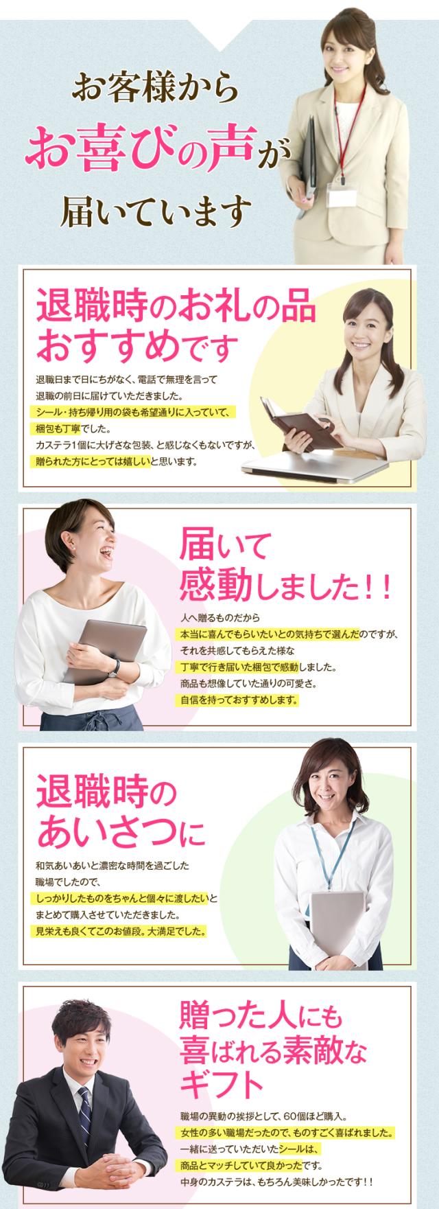- 退職のお礼にと、この商品を選びました。 1つ1つ丁寧に梱包してあり、カステラの味も3種類から選べて、元職場の方に喜んで頂けました。