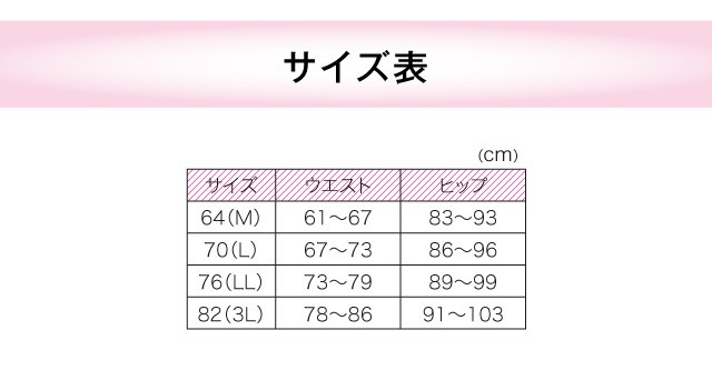 M:ウエスト61〜67cm、ヒップ83〜93cm L:ウエスト67〜73cm、ヒップ86〜96cm