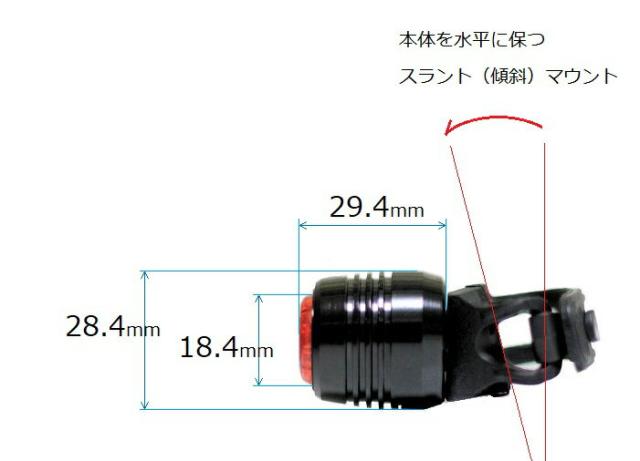 ・傾斜するシートポストに取り付けたときに本体が水平となるよう設計されたマウント部。