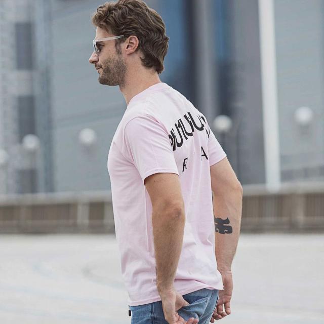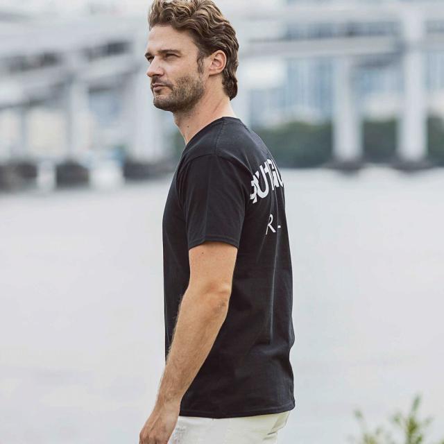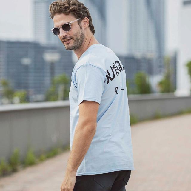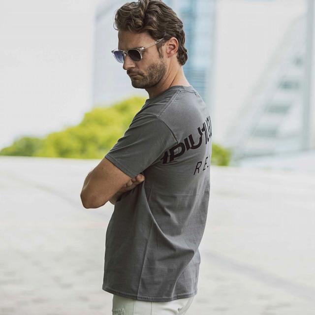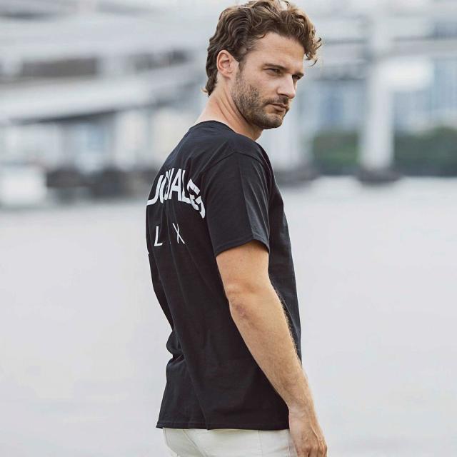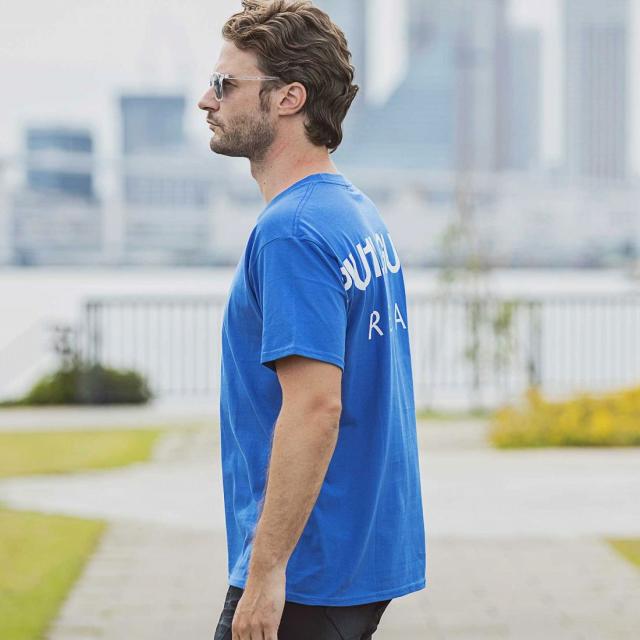バックに大きくロゴがプリントされたクルーネックTシャツ。