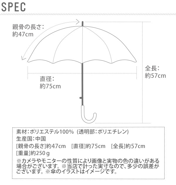 | サイズ | [親骨の長さ]約47cm [直径]約75cm [全長]約57cm ※サイズは当店平置き実寸サイズです。実際の商品とは多少の誤差が生じる場合がございます。あらかじめご了承ください。 |