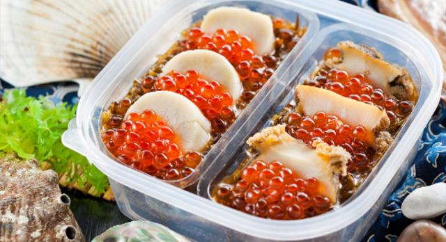 めかぶ醤油漬(めかぶ(三陸産)、しょうゆ、カラフトシシャモ卵、砂糖、みりん、唐辛子、食塩)(国内製造)、いくら醤油漬(鮭卵(国産)、しょうゆ、砂糖、清酒、醸造酢)、煮あわび(あわび(国産)、清酒、食塩)/酒精、調味料(アミノ酸等)、カラメル色素、酸味料、増粘剤(キサンタンガム)、甘味料(カンゾウ)、(一部に小麦・あわび・いくら・大豆を含む)