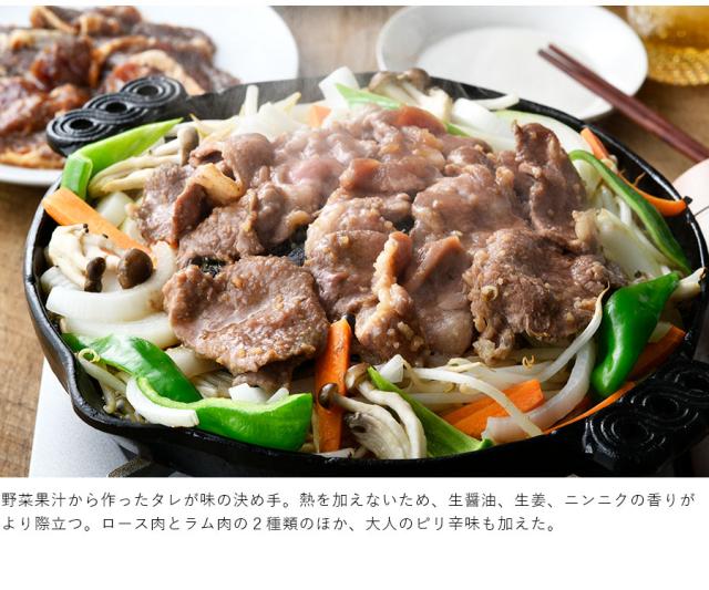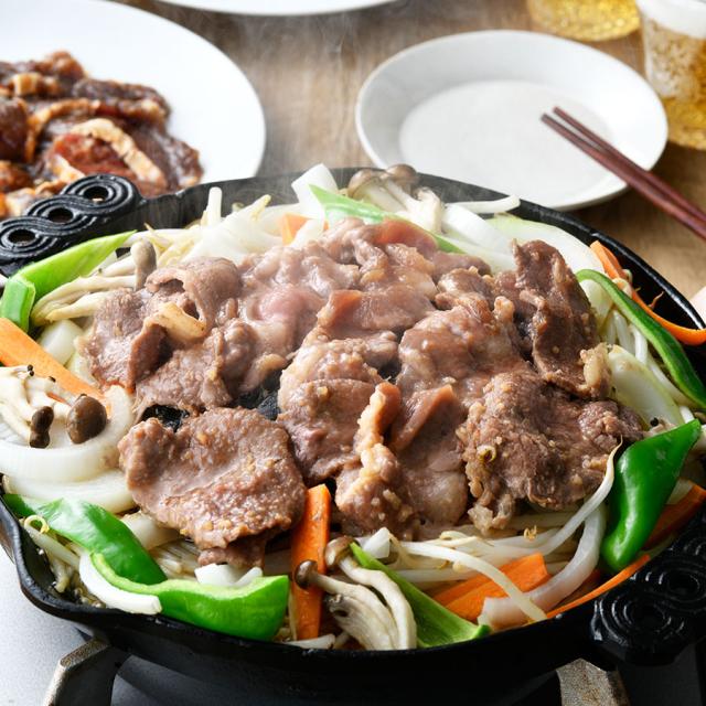 【ラム味付け】羊肉(ニュージーランド産)、たれ(醤油、たまねぎ、にんにく、しょうが、りんご、オレンジ、砂糖、食塩、香辛料)、調味料(アミノ酸)、カラメル色素、(原材料の一部に小麦を含む)