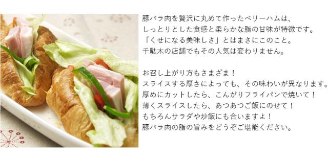 【ベリーハム】豚ばら肉(デンマーク産)、食塩、砂糖、乳たん白、たん白加水分解物/リン酸塩(Na)、カゼインNa、酸化防止剤酸化防止剤(V.C)、発色剤(硝酸K・亜硝酸Na)、調味料(アミノ酸)、(一部に乳成分・豚肉を含む)