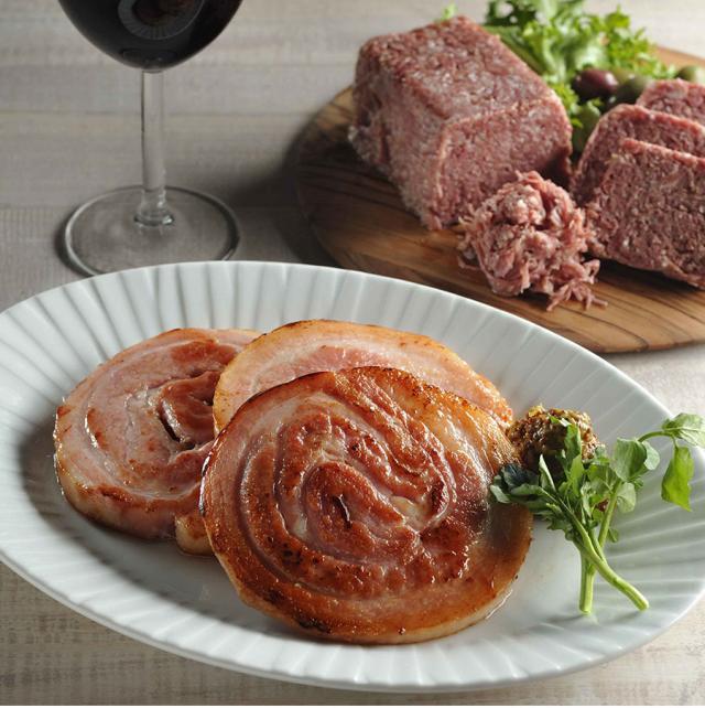 老舗精肉店のハム&コンビーフをお届け。豚バラ肉を丸めて作った「ベリーハム」は、しっとりジューシーな食感と豚の甘みを、名物の「コンビーフ」は牛肉の力強いコクを味わえる。サラダやサンドイッチなどいろんな料理に活用したい。