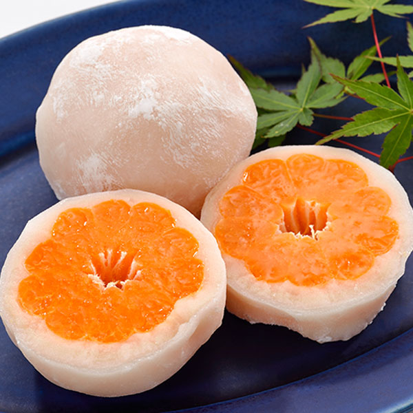 小粒で味の濃い愛媛県産みかんを丸ごと使った大福です。みかんの白い筋を取り除くため手作業にこだわり、味のバランスを考えて餡の甘さを調整。半解凍状態でもシャーベットのようで美味しくお召し上がりいただけます。